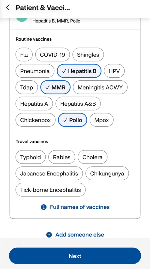 - CVS 앱에서 필요한 백신 재고 확인 — 해당 백신 있는지 확인 후 예약